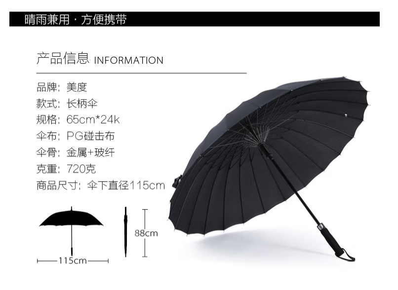 美度(MAYDU) M7003 65cm*24k 雨伞 黑色(单位:把)