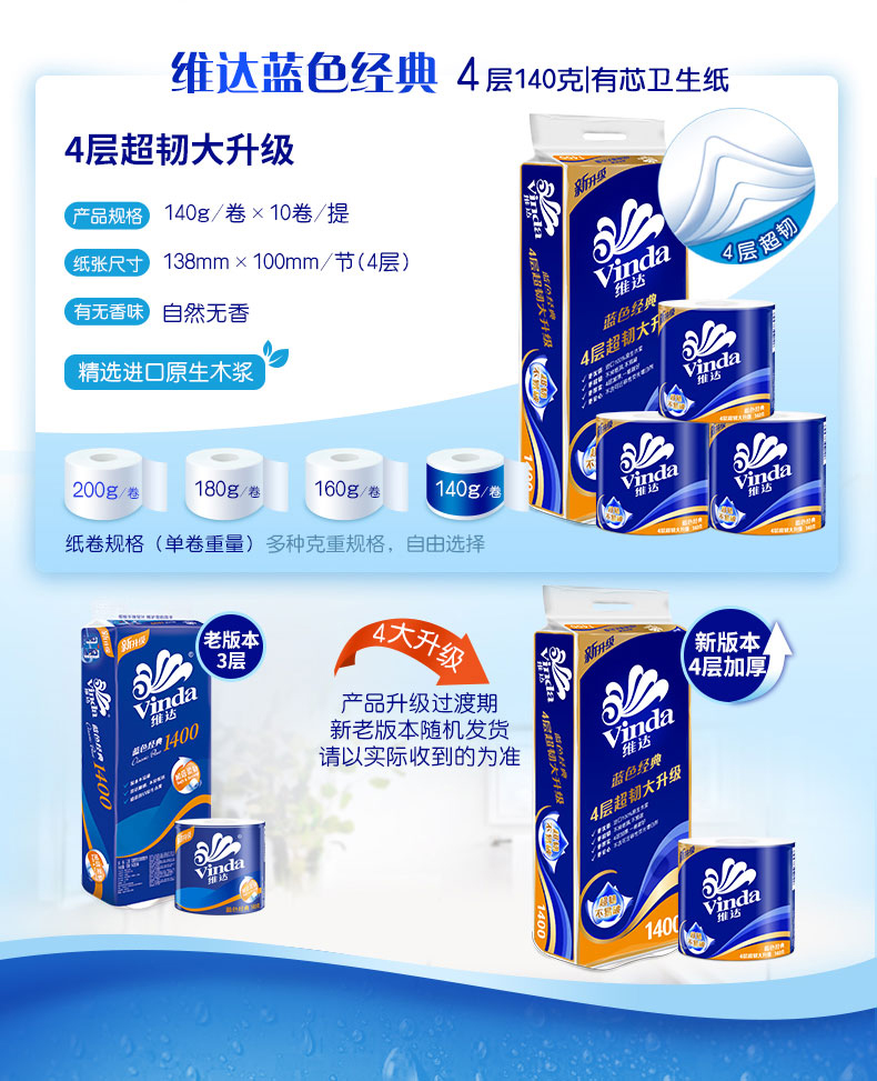 维达 卷纸 蓝色经典4层140克*10卷V4069-10E(单位:提) 白色