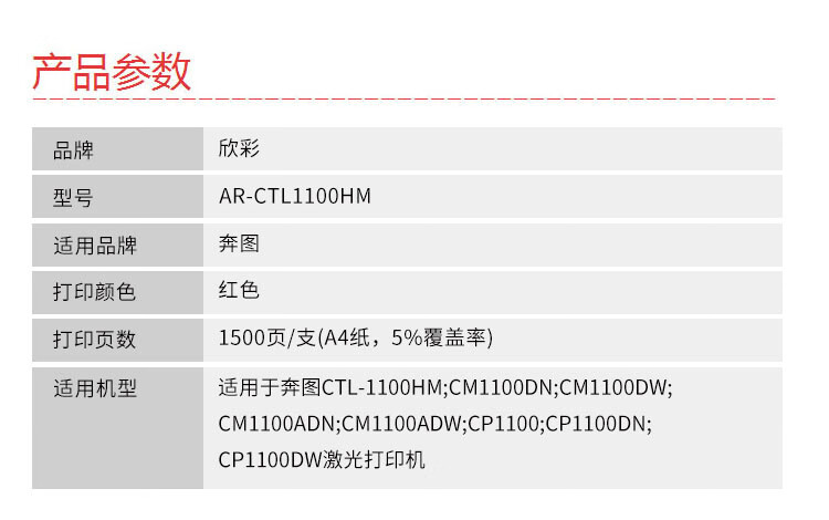欣彩AR-CTL1100HM红色粉盒 高容量硒鼓1.5K 适用于奔图CTL-1100HM CM1100DN CM1100DW CM1100ADN激光打印机 个 红色