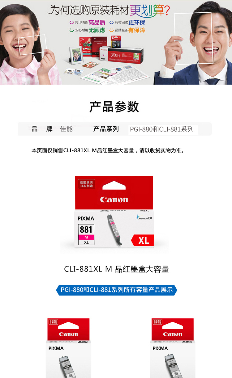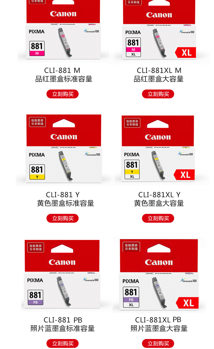 佳能(Canon)CLI-881XL M 大容量品红色墨盒(适用TS8380t/TS708/TS708t/TS9580/TS9180/TS8380) 个 品红色