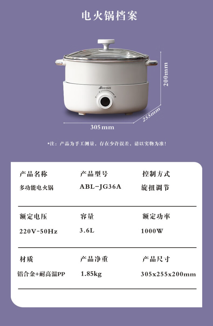 艾贝丽Abereve ABL-JG36A电火锅3.6L 单位:台 白色