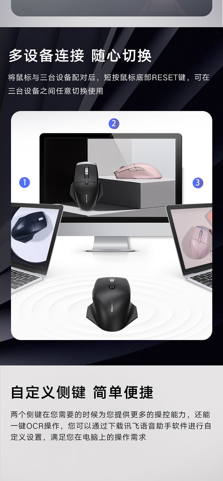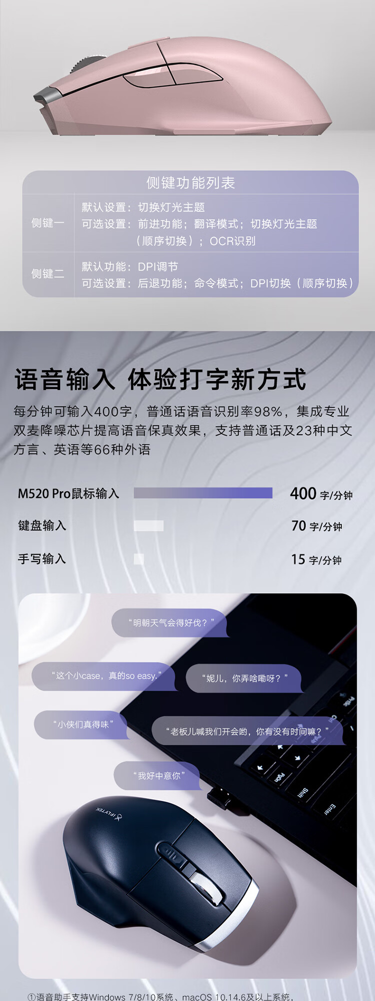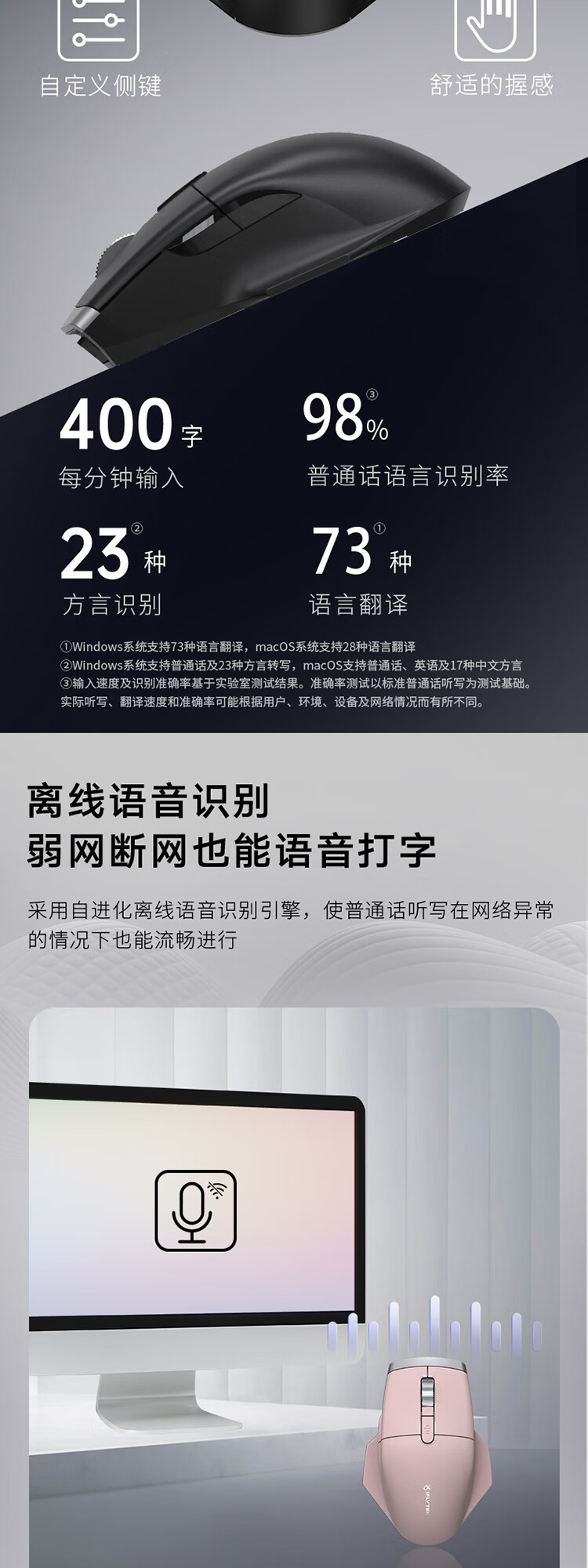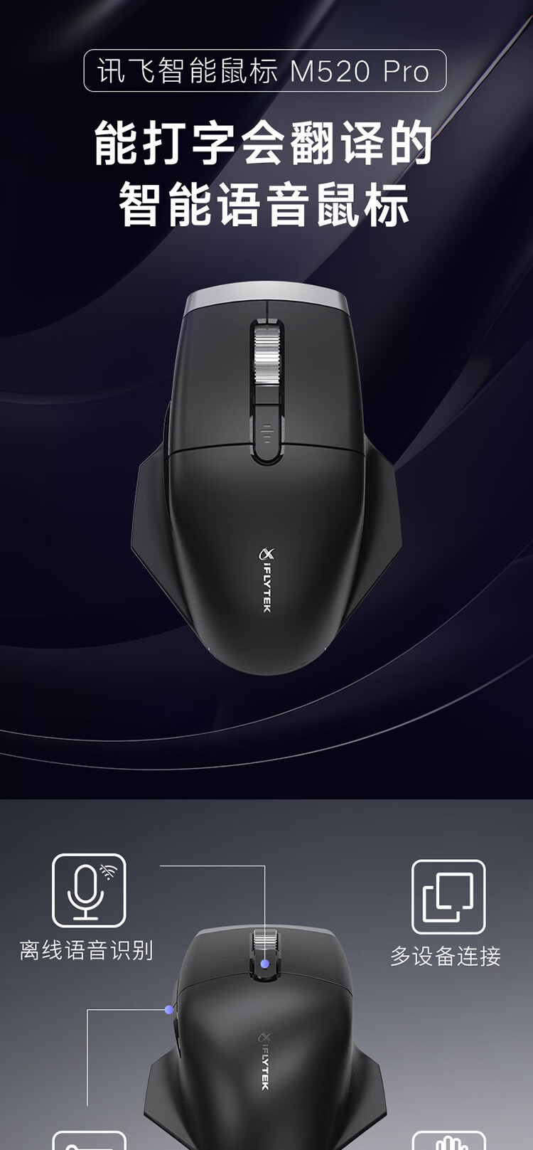 科大讯飞无线蓝牙鼠标M520Pro 办公鼠标 无线外设 人体工学鼠标 舒适握感 自定义侧键 语音输入打字翻译 个 黑色