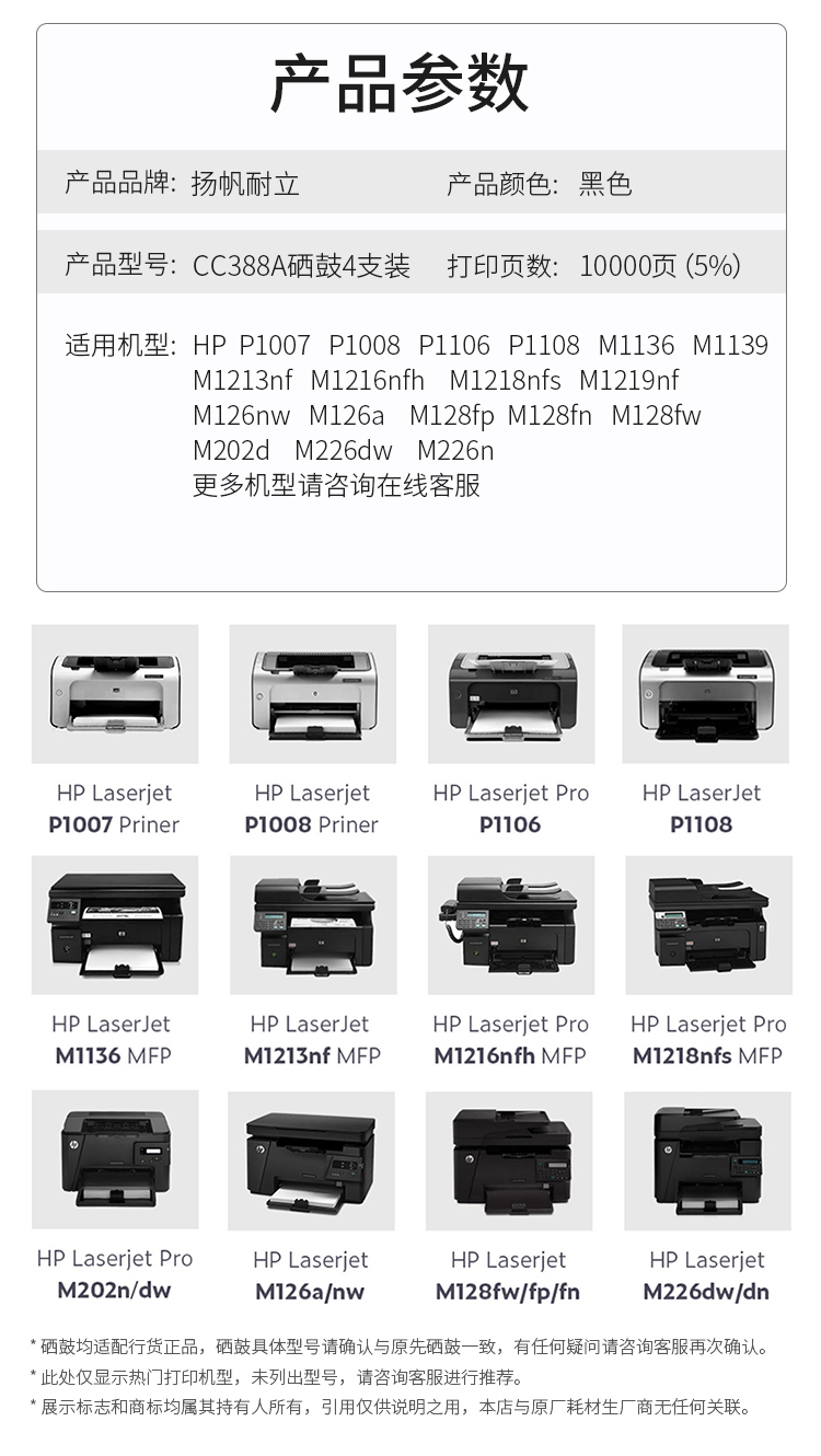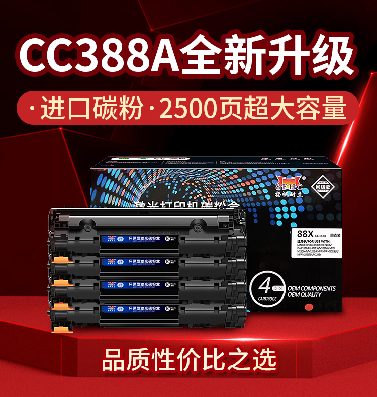 YFHC cc388a硒鼓 适用惠普m1136硒鼓p1108 p1106 m126nw m128fn打印机大容量4支装 惠普m126a硒鼓m1136墨盒 支 黑色