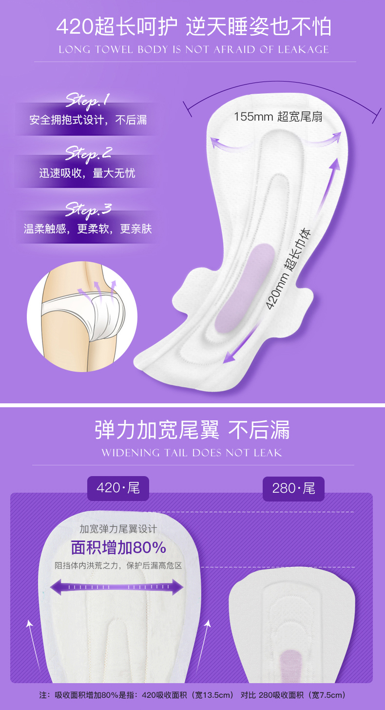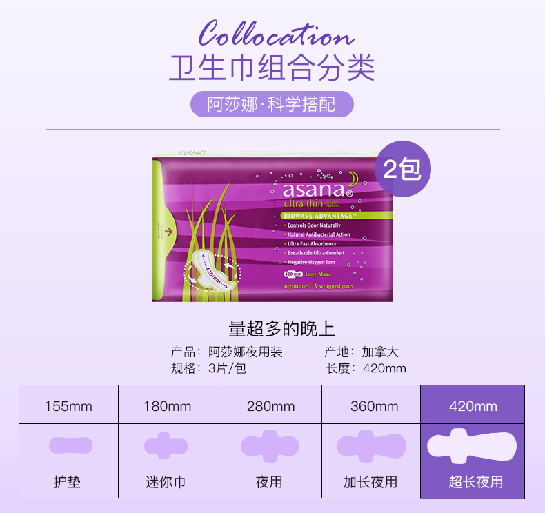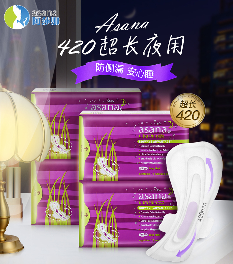 阿莎娜 超薄棉面 420加长型夜用卫生巾3片*2包(计价单位:套) 星云粉