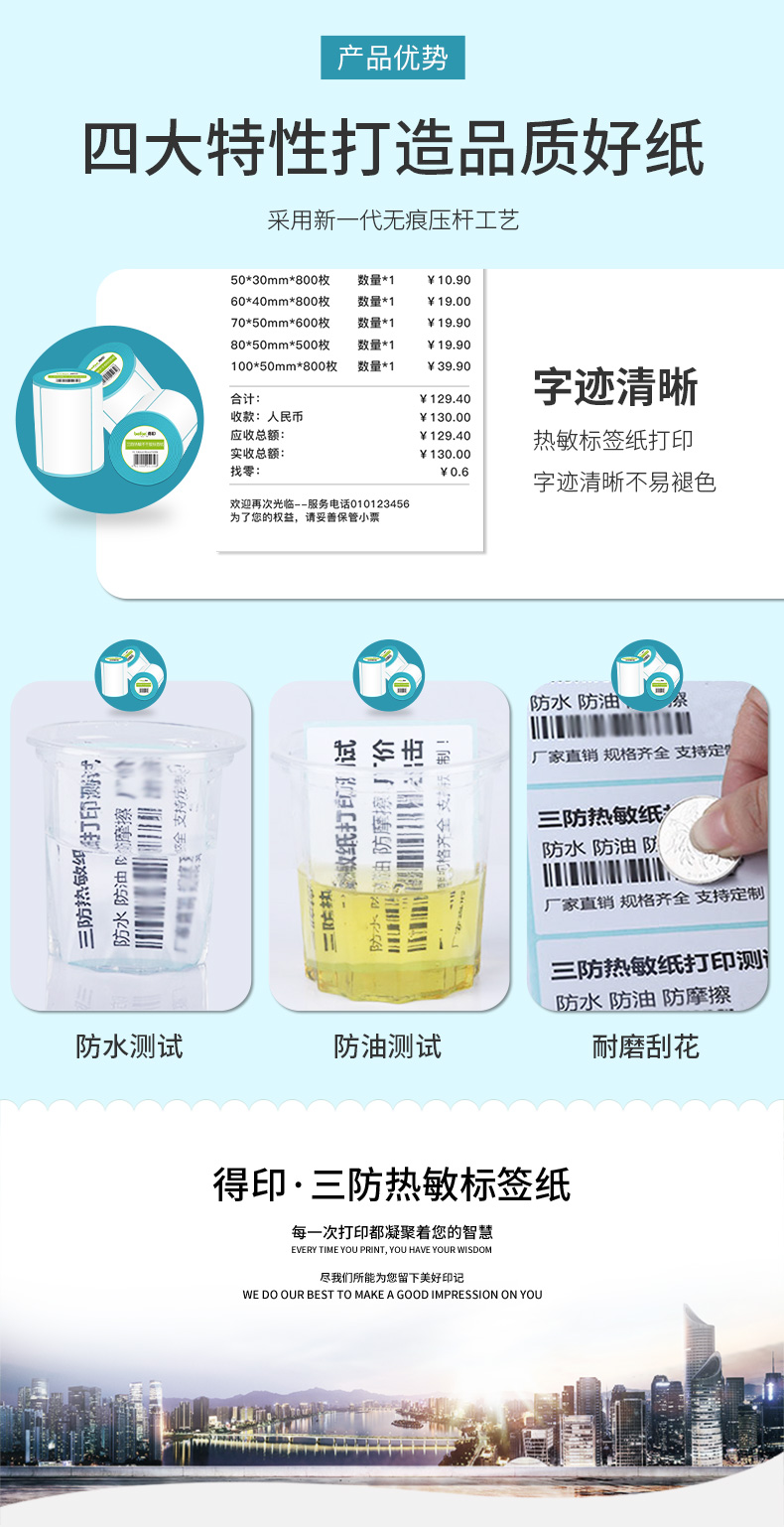 得印三防热敏不干胶标签纸 100*80*500枚 单排圆角6卷 【100mm×80mm×500枚】-6卷