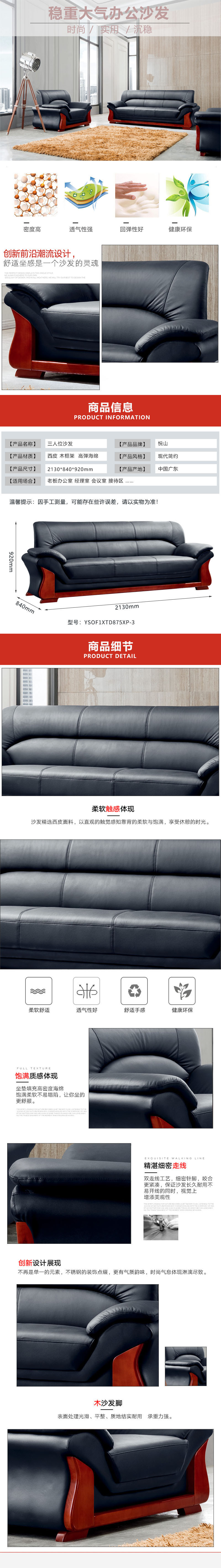 悦山 三人位皮质沙发商务办公沙发 2130*840*920mm*1张 黑色