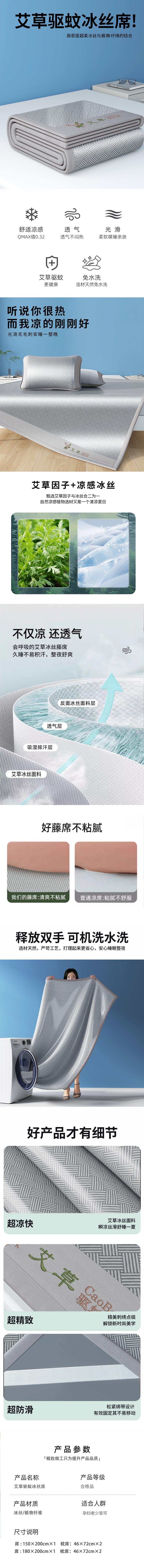 紫韵 艾草驱蚊冰丝席三件套 ZY-BT1793 180×200CM 浅灰色(单位:套)