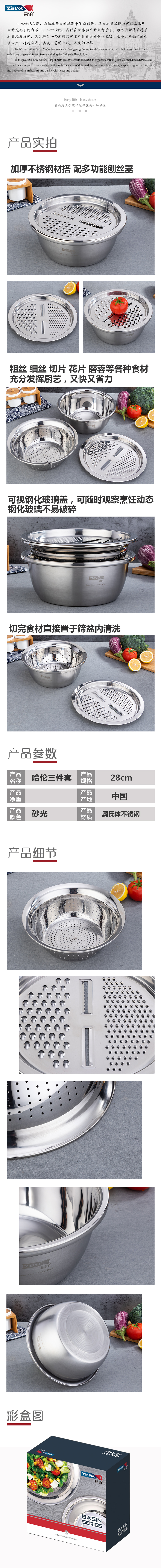 【yispot易铂】哈伦三件套盆YP-8076盆+米筛+刨丝盘(单位:套) 不锈钢色