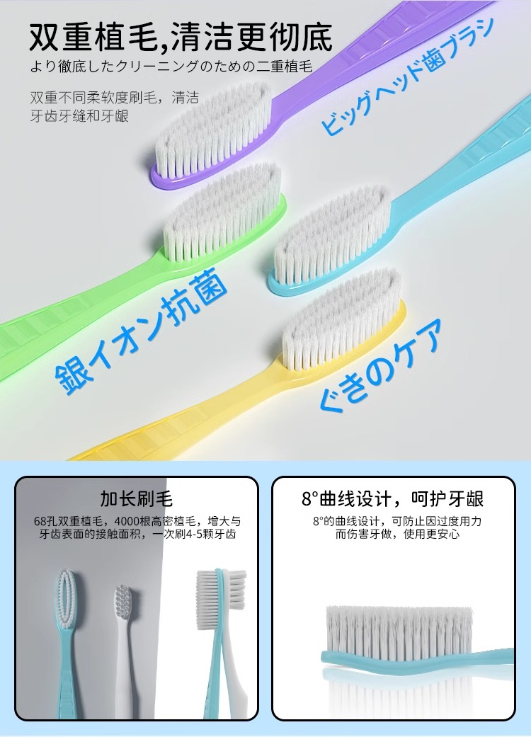 酷优客(CCOKIO) 抑菌软毛68孔大刷头牙刷4 银离子抑菌毛酷刷头 4支装*3组(12支) 混色(单位:组)