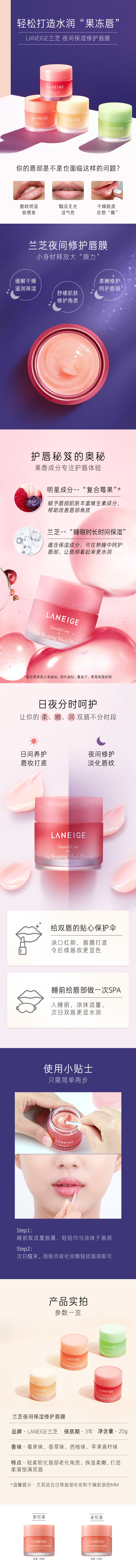 兰芝 夜间保湿修护唇膜20g(莓果味) 钢琴白