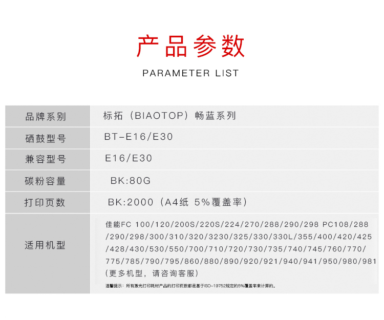 标拓 BT-E16/E30 打印量2000页 适用佳能FC 100/120/200S/220S 硒鼓 1.00 只/支 (计价单位:支) 黑色