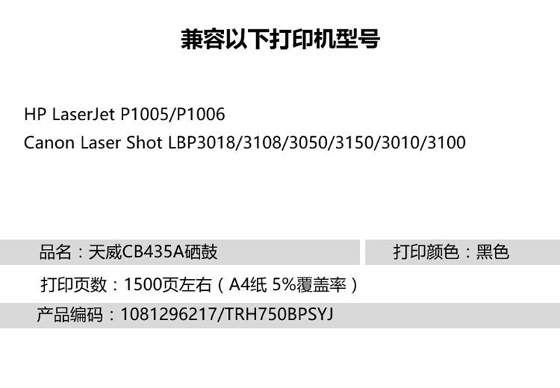 天威(PrintRite) PR-CB435AR 专业装 打印量约1500页 适用HP P1003等 硒鼓 1.00 只/支 (计价单位:支) 黑色