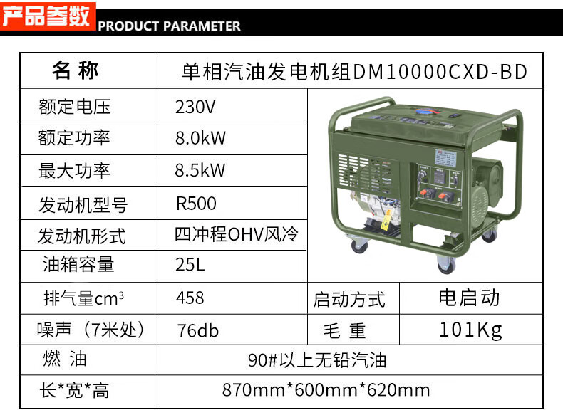 东明 DONMIN 单相8KW小型汽油发电机组,建筑施工配套应急备用汽油发电机DM10000CXD-BD 绿色