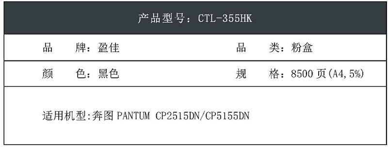 盈佳(Ink Cartridge) CTL-355HK 打印量8500页 适用奔图 CP2515DN/CP5155DN 粉盒 (计价单位:个) 黑色 粉盒 1.00 只/个 (计价单位:个) 黑色