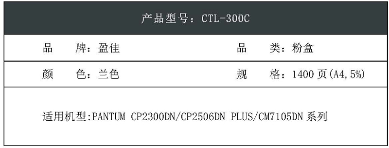 盈佳(Ink Cartridge) CTL-300C 打印量1400页 适用CP2300DN/CP2506DN PLUS 粉盒 (计价单位:个) 兰色 粉盒 1.00 只/个 (计价单位:个) 兰色
