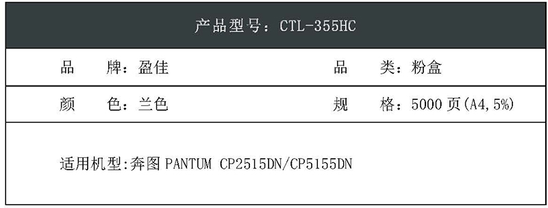 盈佳(Ink Cartridge) CTL-355HC 打印量5000页 适用奔图 CP2515DN/CP5155DN 粉盒 (计价单位:个) 兰色 粉盒 1.00 只/个 (计价单位:个) 兰色