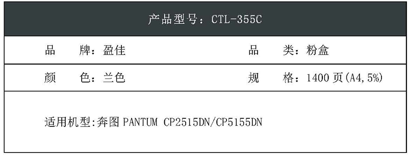 盈佳(Ink Cartridge) CTL-355C 打印量1400页 适用奔图 CP2515DN/CP5155DN 粉盒 (计价单位:个) 兰色 粉盒 1.00 只/个 (计价单位:个) 兰色