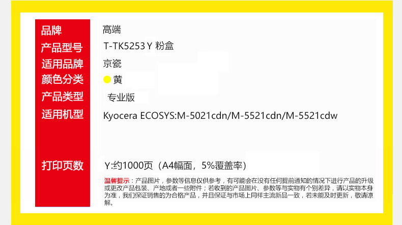 高端TECH-A T-TK5253Y粉盒专业版黄色适用京瓷Kyocera ECOSYS:M5021cdn彩色打印机M5521cdn墨粉盒M5521cdw碳粉盒 黄色