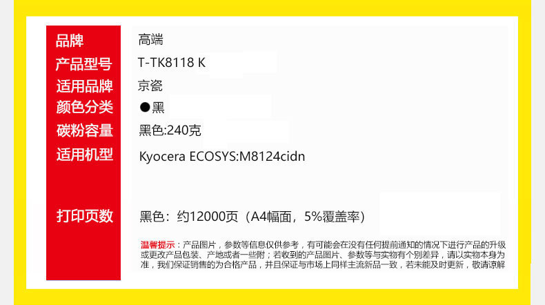 高端TECH-A T-TK8118K粉盒专业版 黑色 适用Kyocera ECOSYS:M8124cidn 黑色
