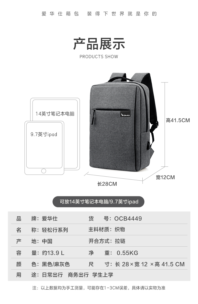 爱华仕(OIWAS) 公文包 OCB4449 13.9L 黑色(单位:个)