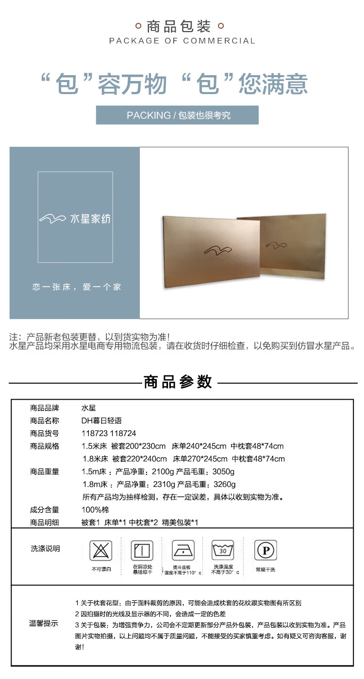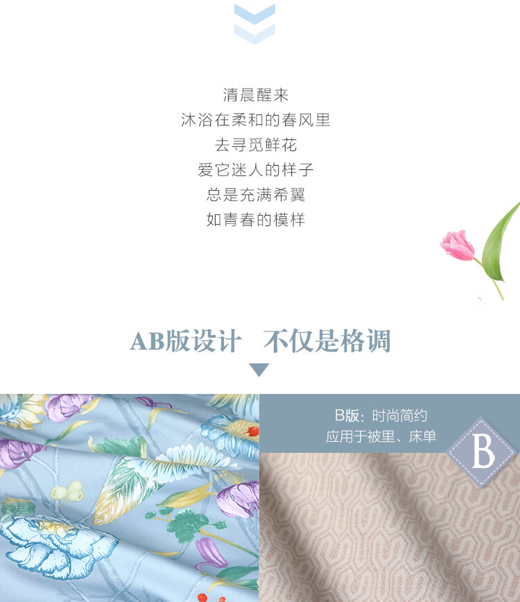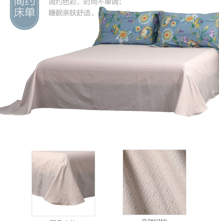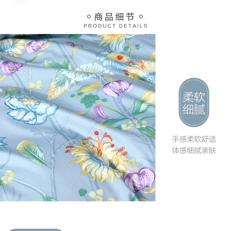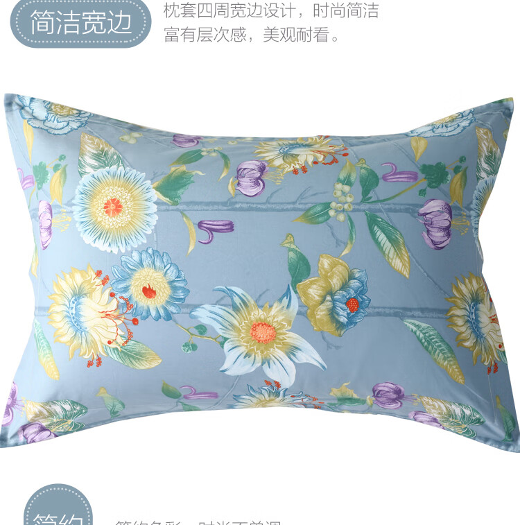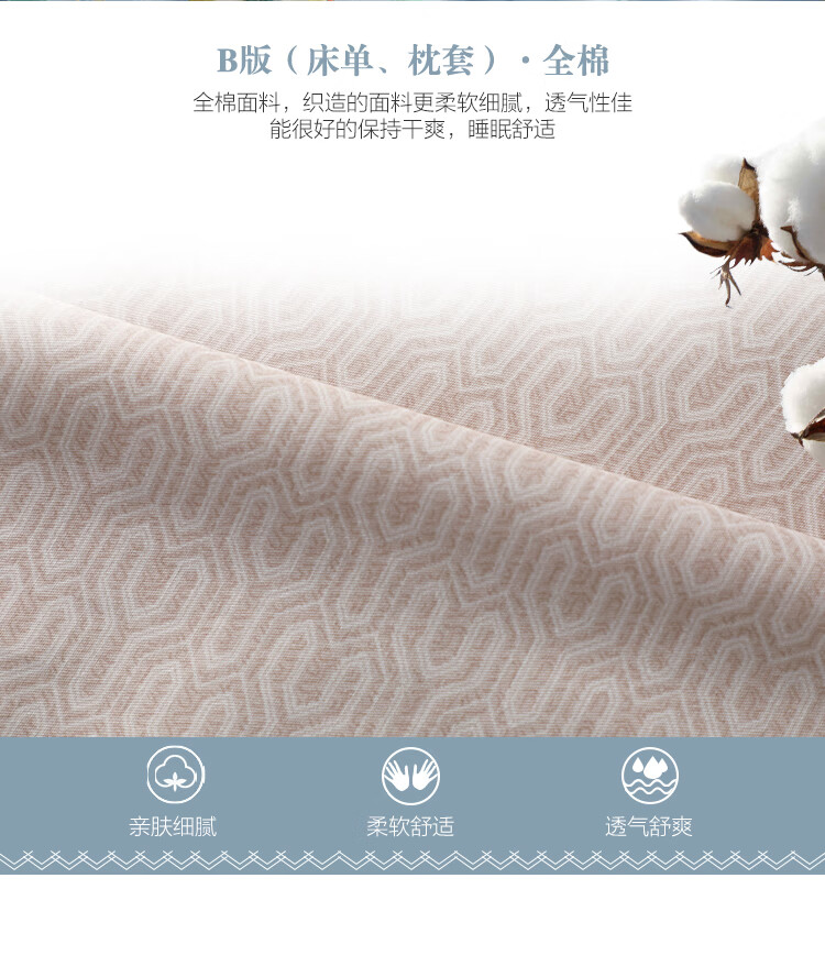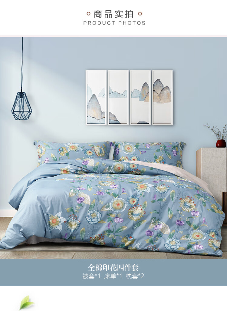 水星家纺 全棉抗菌四件套被套床单枕套床上用品套件全棉被罩被单1.5米床 暮日轻语 蓝色