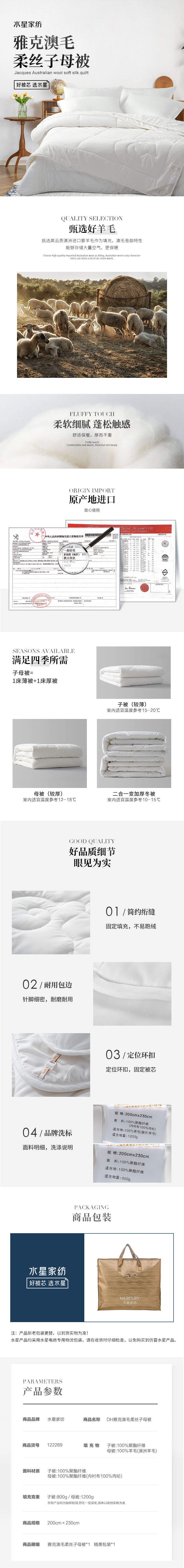 水星家纺 澳毛柔丝二合一子母被 雅克 200X230cm 纯色 白色(单位:床)