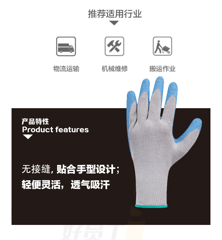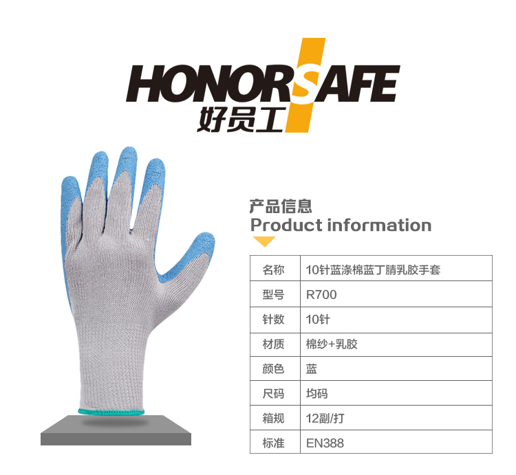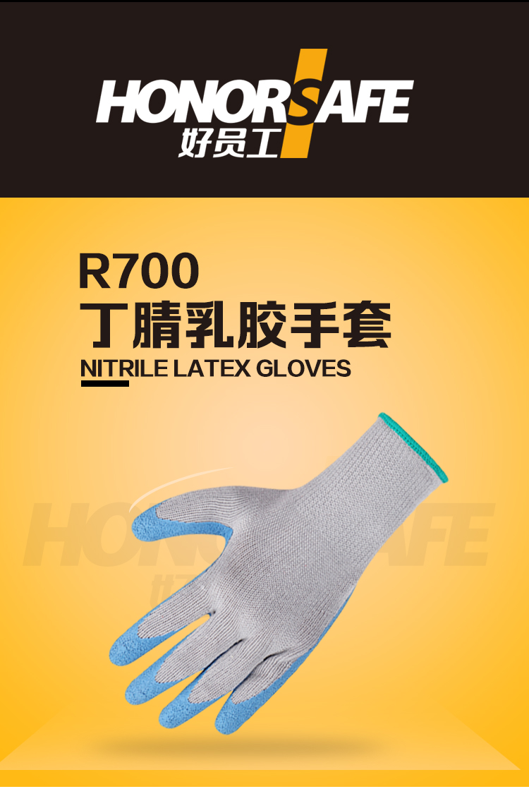 好员工 R700 10针蓝涤棉蓝丁腈乳胶浸胶起皱耐磨防滑尼龙线防护手套 12副/打 灰蓝色