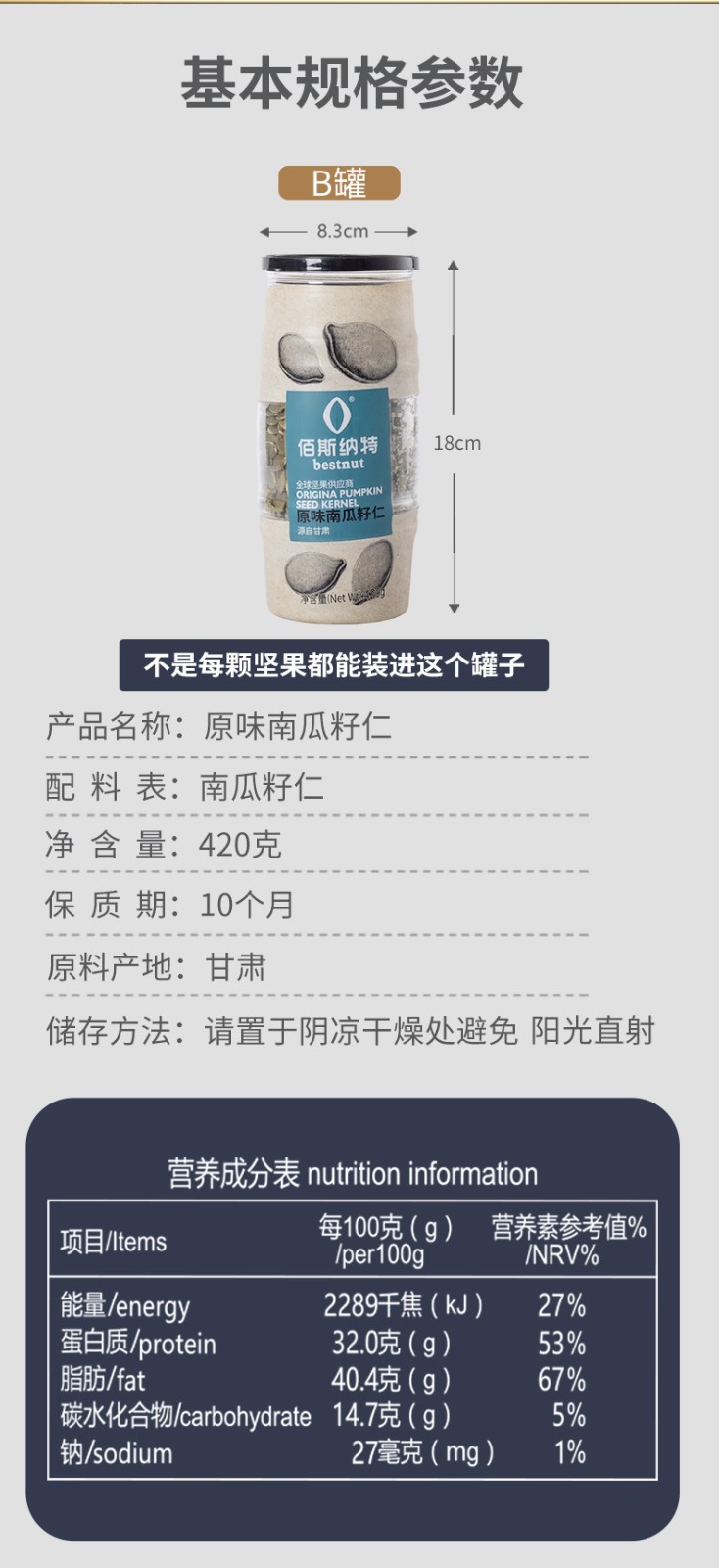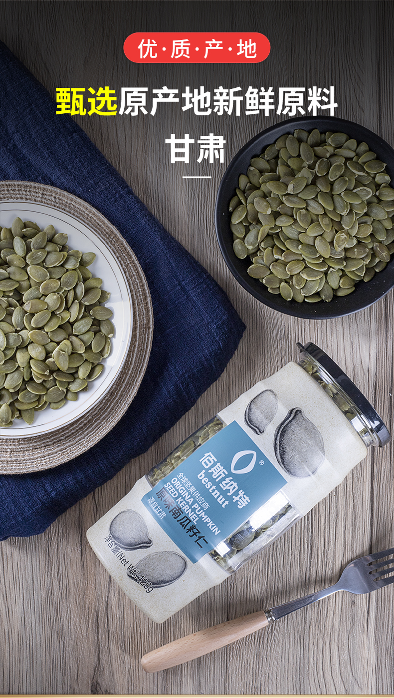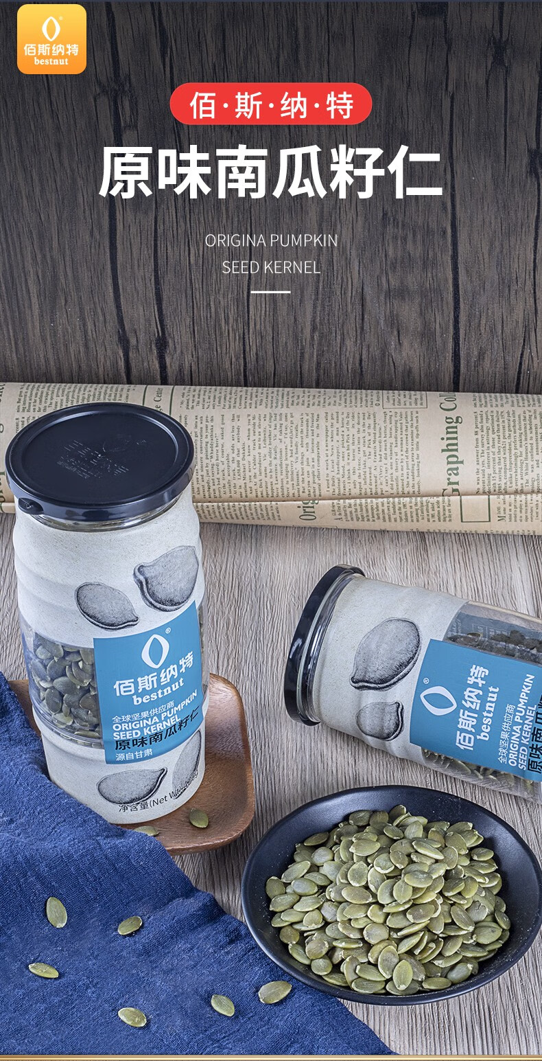 佰斯纳特(bestnut) 南瓜子仁 原味生南瓜籽仁大颗粒无壳免剥坚果炒货干果小吃零食甘肃特产 【日期新鲜】B罐/420g【甘肃直采原材料】