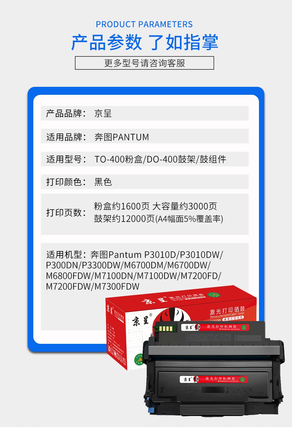 京呈 TO-400碳粉+芯片适用奔图m7300fdn M7100DW/DN P3010D(单位:瓶) TO-400碳粉+芯片