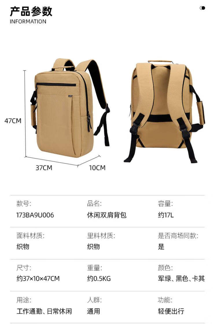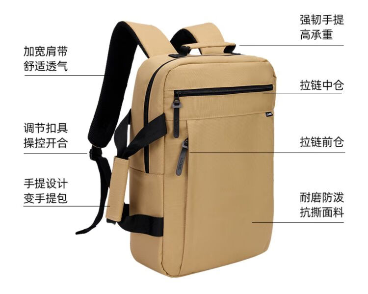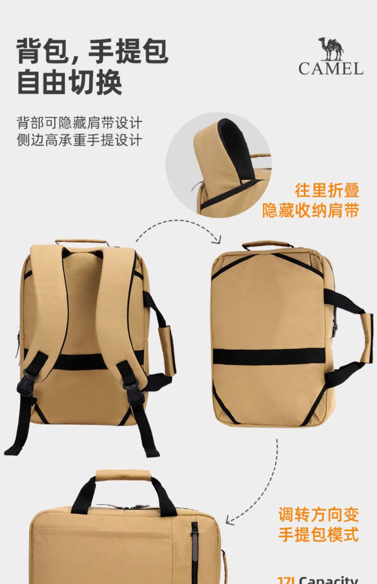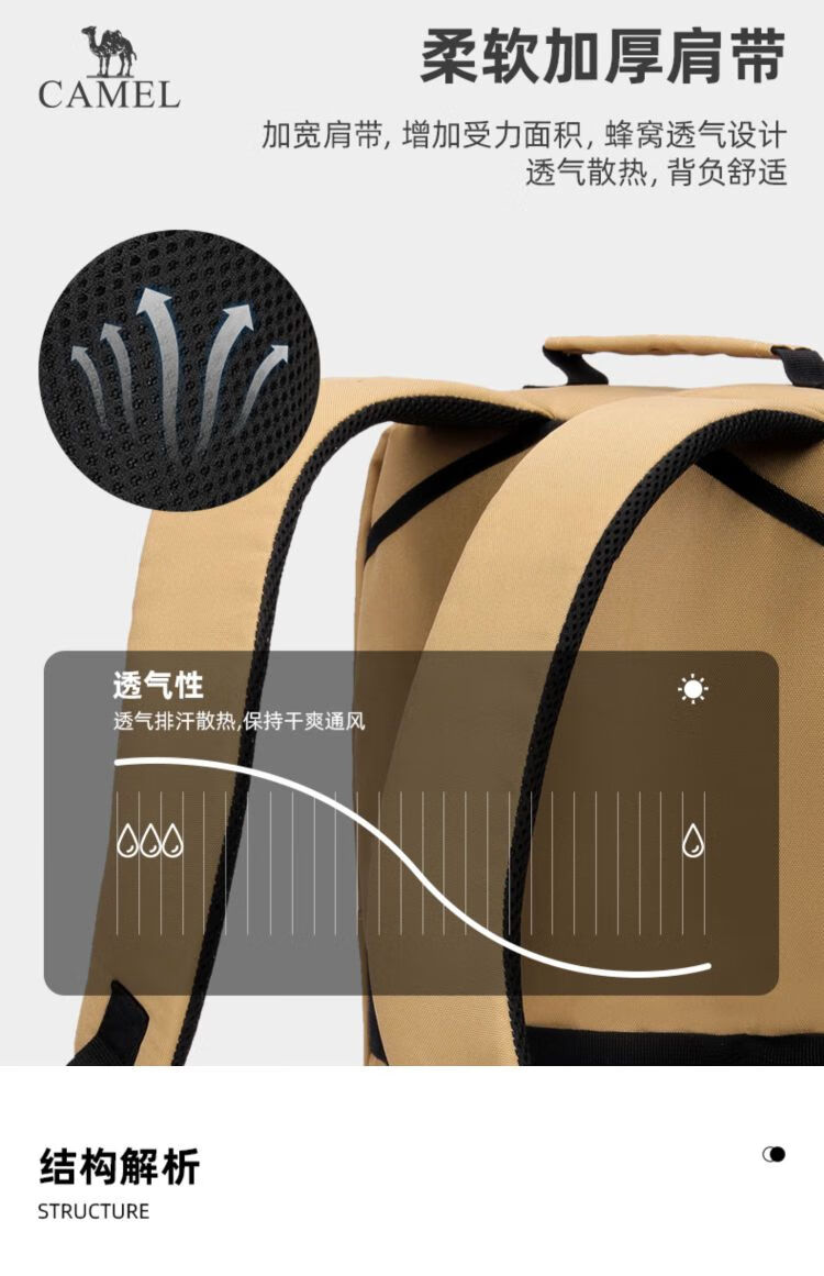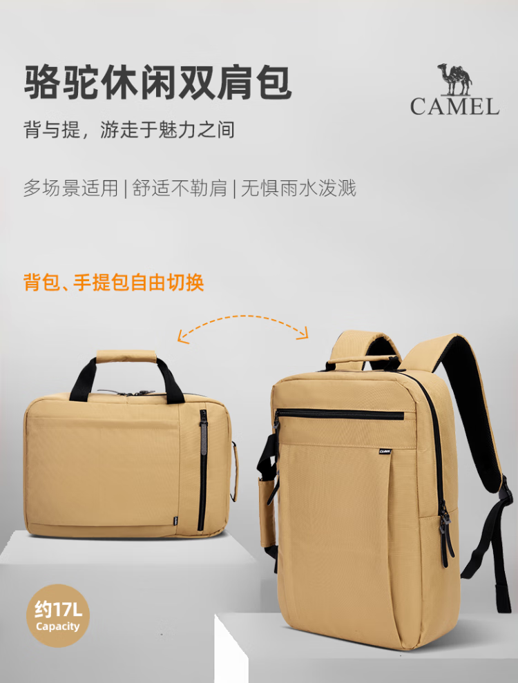 骆驼双肩包户外大容量手提电脑包轻便通勤包笔记本休闲学生登山包 173BA9U006 个 卡其色