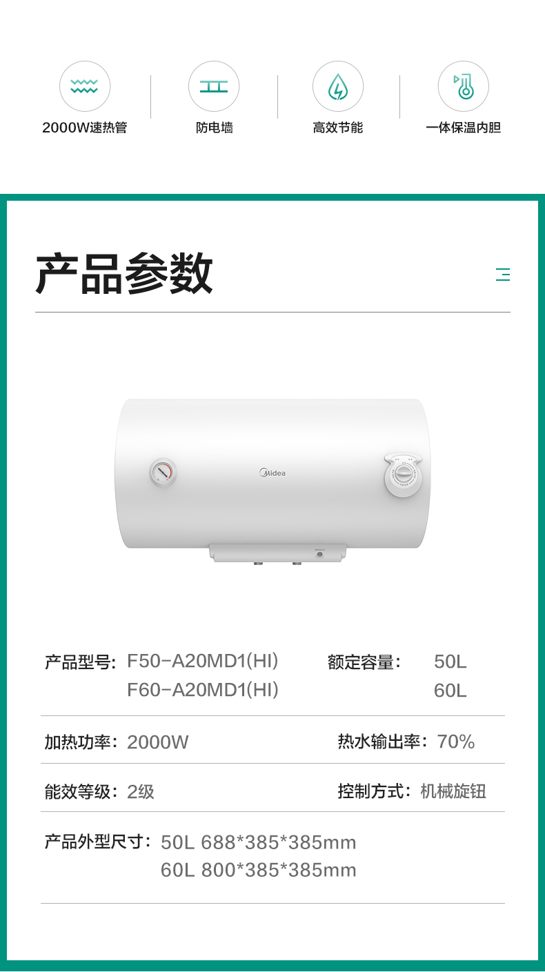 美的(Midea) F60-A20MD1(HI) 60L 电热水器 白色(单位:台)