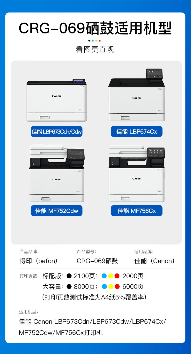 得印 CRG069硒鼓四色套装 佳能LBP673Cdw LBP673Cdn MF752Cdw单位:支 含芯片大容量-四色硒鼓-26000页