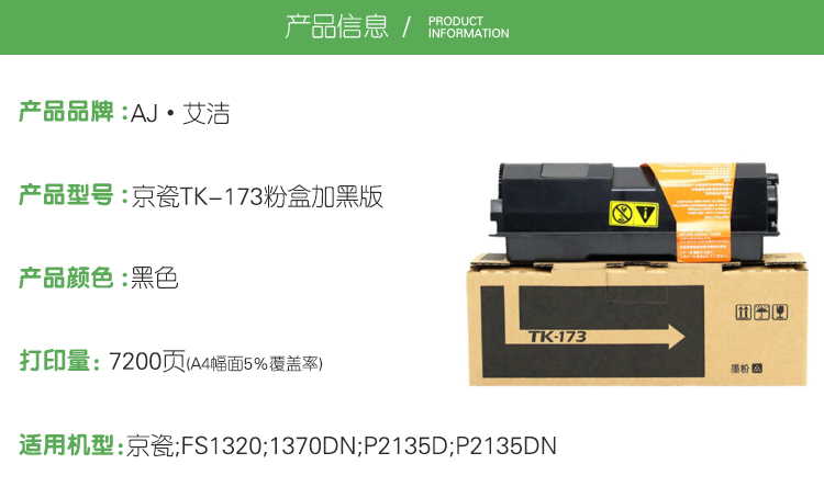 艾洁(AJ) TK-173 打印量7200页 适用京瓷;FS1320;1370DN;P2135D;P2135DN 粉盒 (计价单位:只) 黑色
