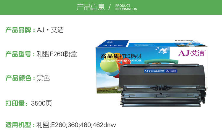 艾洁(AJ) E260 打印量3500页 适用利盟;E260;360;460;462dnw 粉盒 (计价单位:只) 黑色