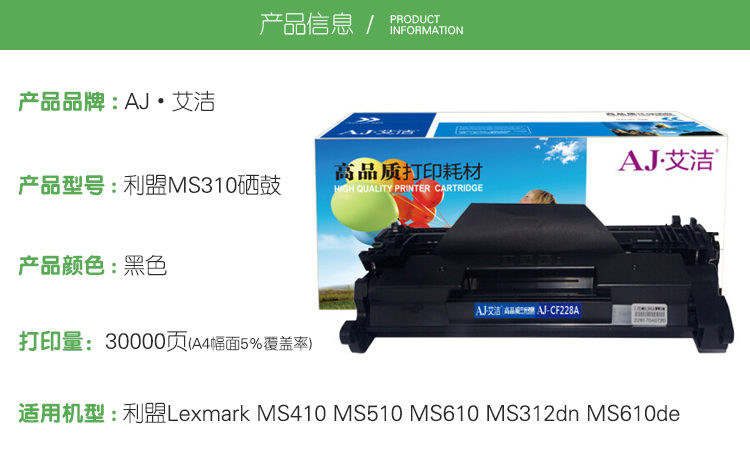 艾洁(AJ) MS310 打印量30000页 适用利盟Lexmark MS410 MS510 MS610 MS312dn MS610de MS415dn 硒鼓 (计价单位:只) 黑色