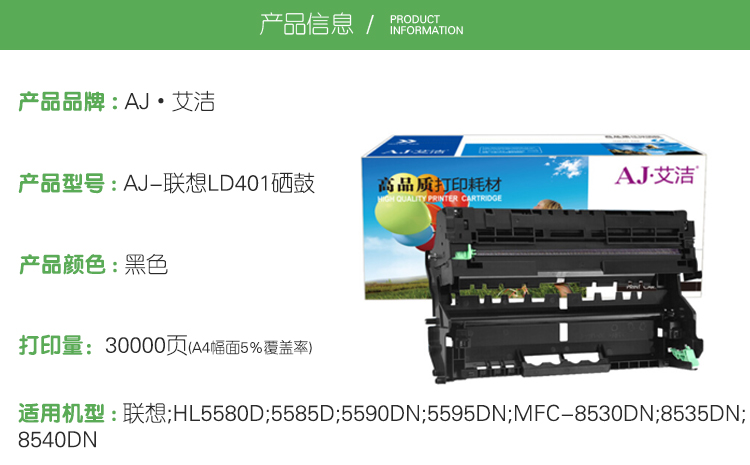 艾洁(AJ) LD401 打印量30000页 适用联想/HL5580D/5585D/5590DN/5595DN/MFC-8530DN/8535DN/8540DN 硒鼓 (计价单位:只) 黑色