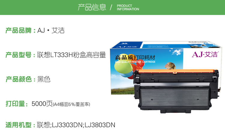 艾洁(AJ) LT333H(高容量5000页) 打印量5000页 适用联想;LJ3303DN;LJ3803DN 粉盒 (计价单位:只) 黑色