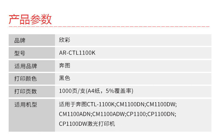 欣彩AR-CTL1100K黑色粉盒 硒鼓1K 适用于奔图CTL-1100K CM1100DN CM1100DW CM1100ADN CM1100ADW激光打印机 个 黑色