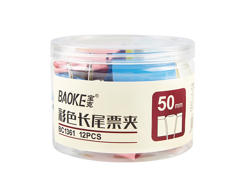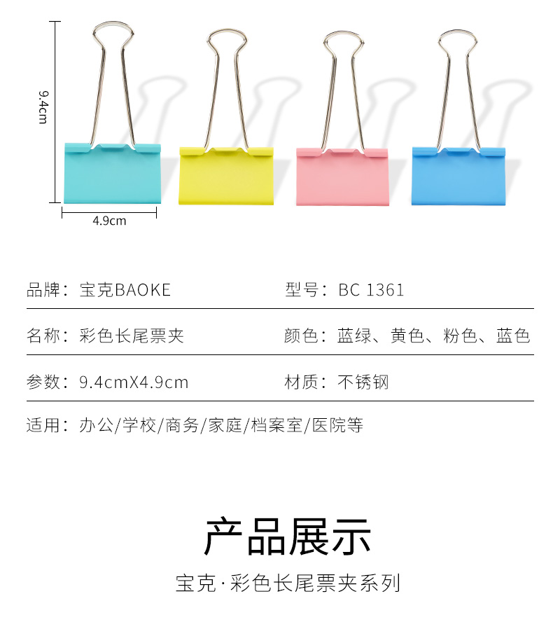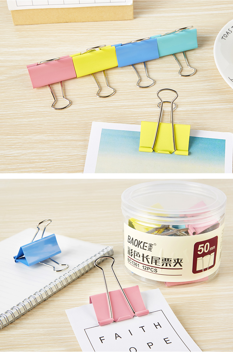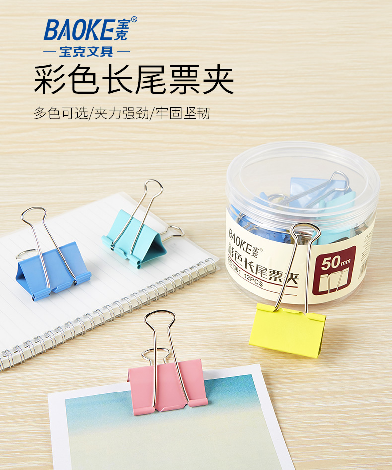 宝克(BAOKE)BC1361 50mm大号彩色长尾票夹 大号金属燕尾夹票据夹子 2筒/组 彩色