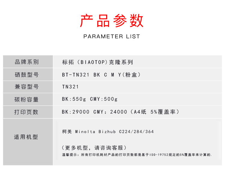 标拓 BT-TN321 Y 24000页 适用柯美bizhub C224 粉盒 1.00 只/支 (计价单位:支) 黄色
