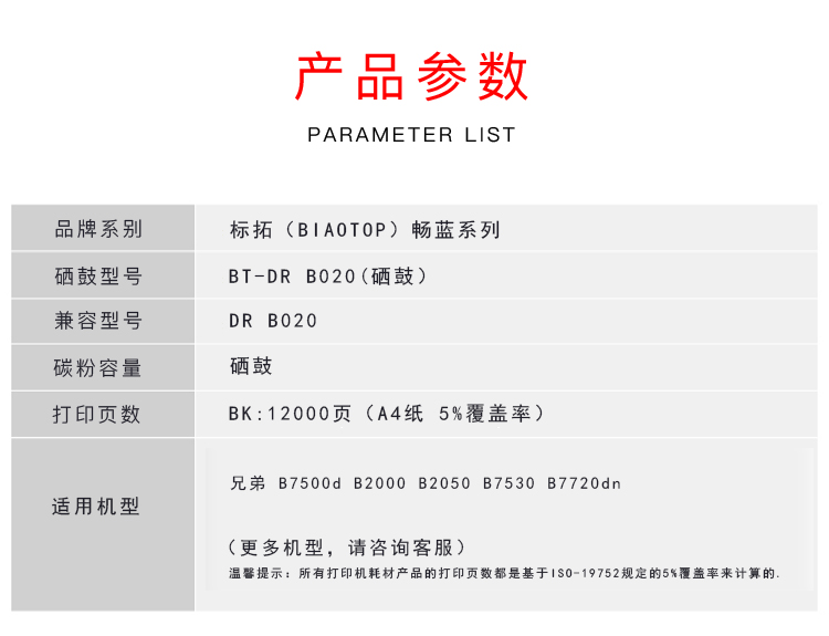 标拓 BT-DR B020 12000页 适用机型:兄弟B7500d B2000 B2050 B7530 B7720dn打印机 硒鼓 1.00 只/盒 (计价单位:盒) 黑色
