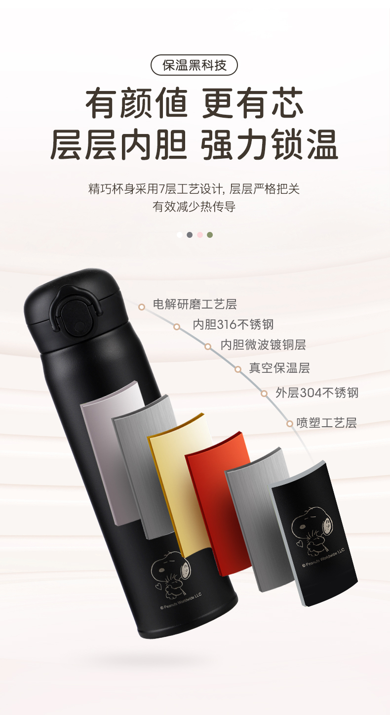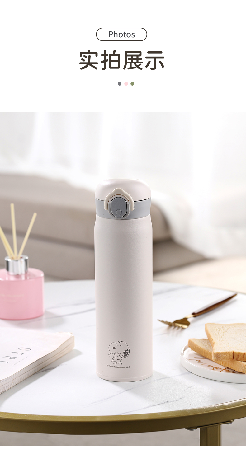 史努比 保温杯 316不锈钢大容量儿童户外便携饮水杯 男女小学生一键弹盖直饮喝水杯子500ml SNP-6025 (单位:个) 白色