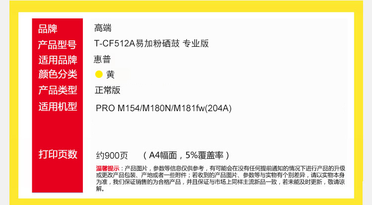 高端TECH-A T-CF512A易加粉硒鼓 黄色 适用惠普HP PRO M154彩色打印机M180N碳粉盒M181fw墨粉盒204A 黄色