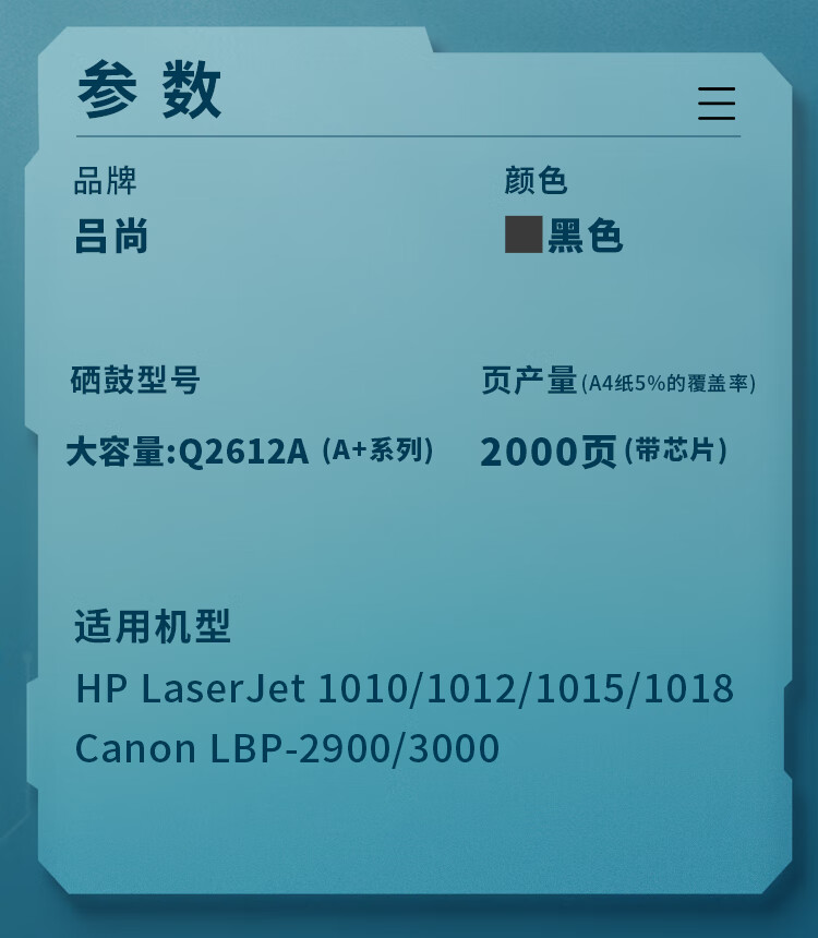 吕尚 Q2612X/CRG303(A系列)大容量硒鼓 适用惠普HP1010 1012 1015 1018 12A/FX9黑硒鼓(约3000页) 硒鼓 (计价单位:只) 黑色 黑色