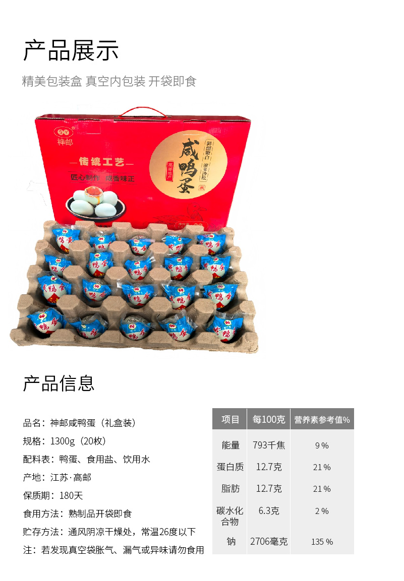 神邮 高邮咸鸭蛋 20枚*65克 咸香流油 油黄沙松 红色(单位:盒)