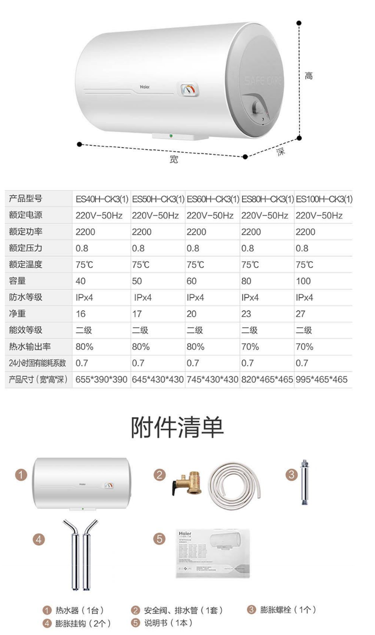 海尔(Haier)ES60H-CK3(1) 60L 机械控制 防电墙横式 2200W速热 二级能效 2-3人 白色