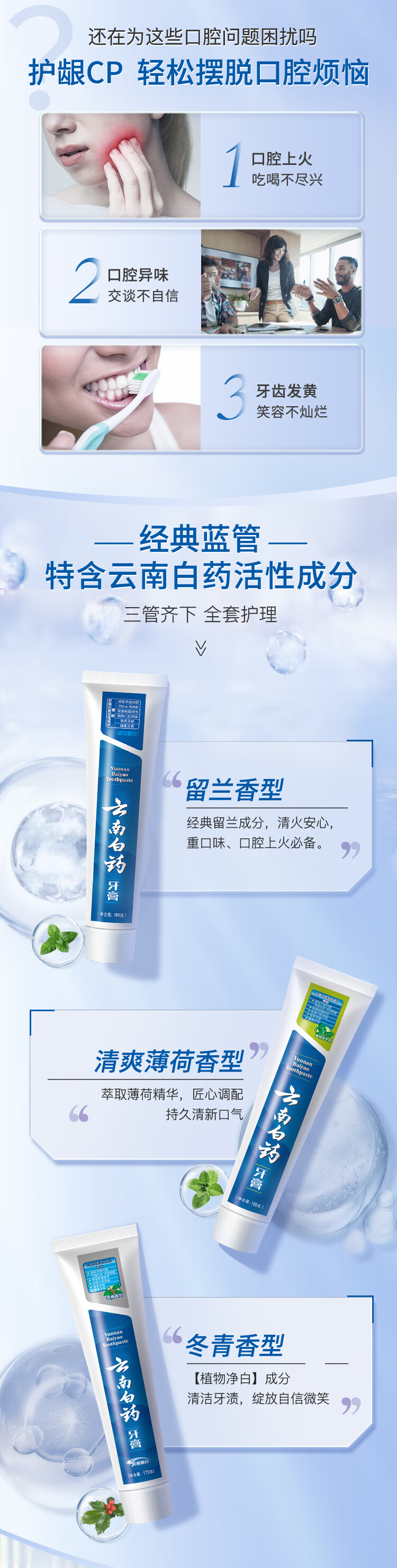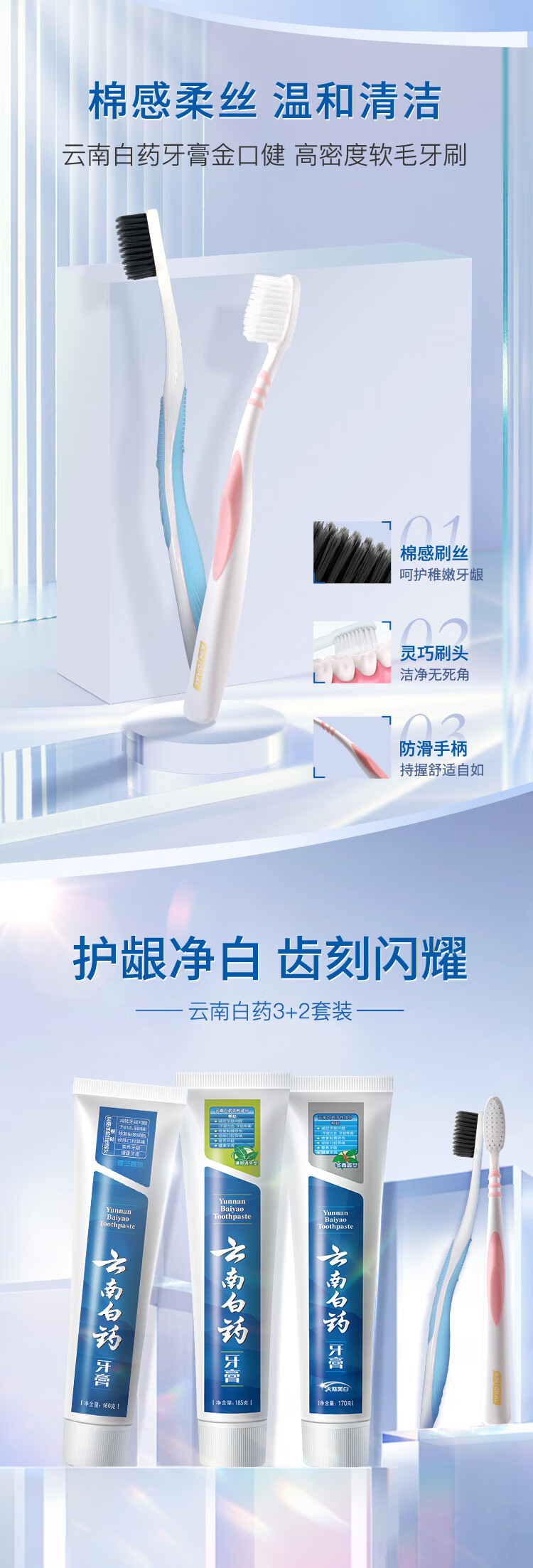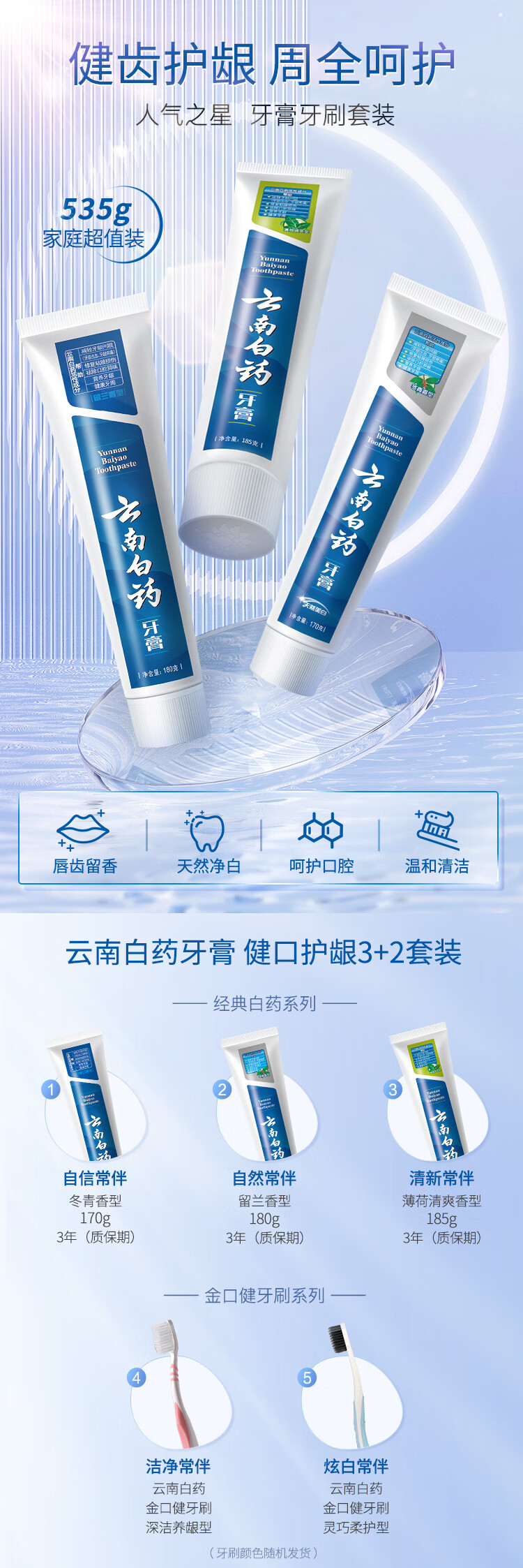 云南白药 人气3+2牙膏套装 (留兰香180g+薄荷清爽185g+冬青香170g+2支牙刷)牙刷随机发货 蓝色