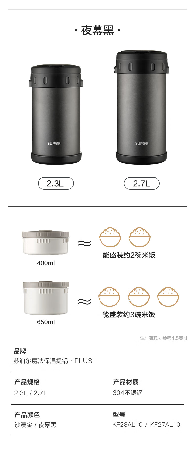 苏泊尔(SUPOR)304不锈钢魔法保温提锅2.3L KF23AL10(个) 夜幕黑