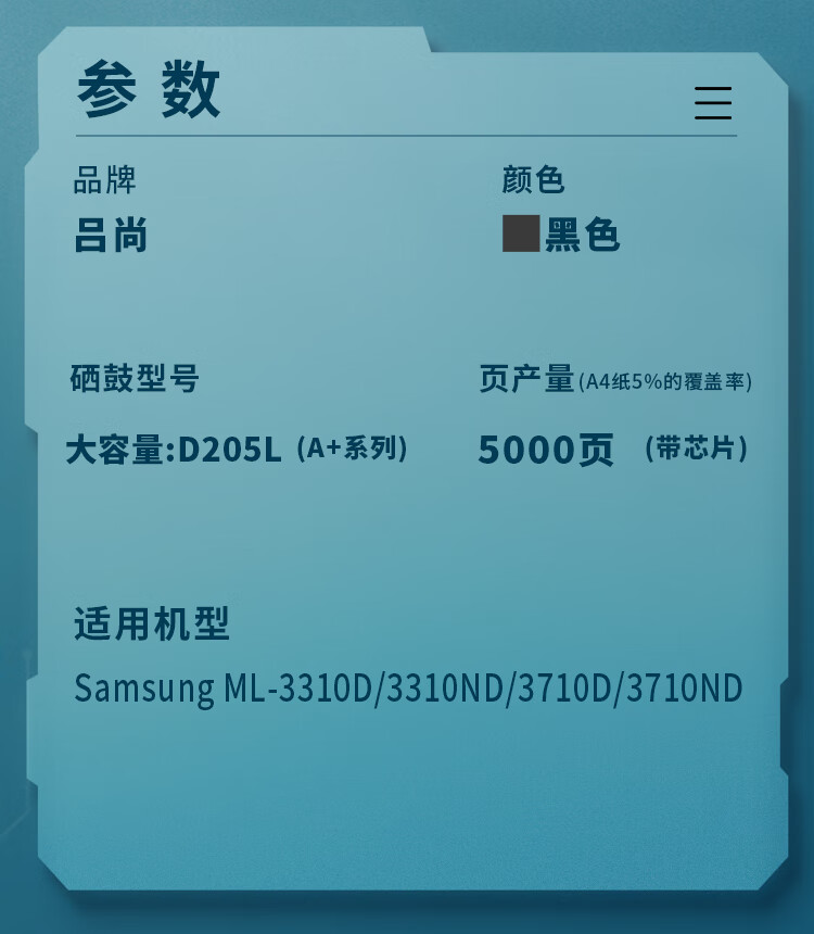 吕尚 MLT-D205L(A+系列) 大容量硒鼓 适用于Samsung ML-3310D/3310ND/3710D/3710ND (约5000页) 硒鼓 (计价单位:只) 黑色 黑色