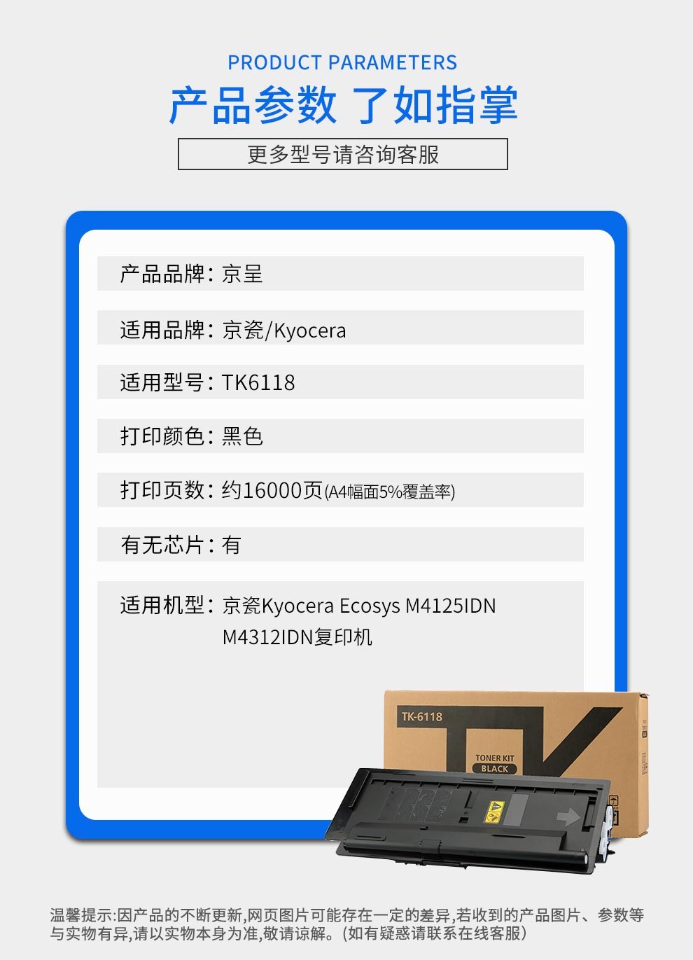 京呈适用京瓷TK6118粉盒Kyocera Ecosys M4125idn碳粉M4125墨盒墨粉硒鼓/支 TK-6118 碳粉(300g)+芯片
